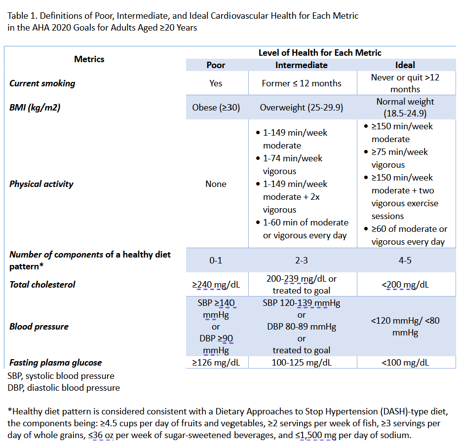 - Lloyd-Jones DM, Hong Y, Labarthe D, et al. Defining and setting national goals for cardiovascular health promotion and disease reduction: the American Heart Association's strategic Impact Goal through 2020 and beyond. Circulation. Feb 2 2010;121(4):586-613. doi:10.1161/circulationaha.109.192703